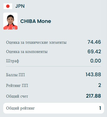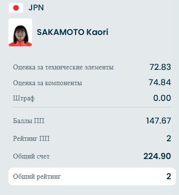 Без ошибок японка: тройной флип+тройной тулуп, тройной риттбергер, тройной сальхов, двойной аксель, комбинационное вращение 4, тройной лутц+двойной аксель, тройной лутц+двойной тулуп+двойной риттбергер, тройной флип, дорожка шагов 4 и заклон 4.