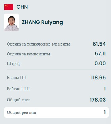 Исполнила китаянка тройной флип+двойной тулуп, тройной сальхов+тройной тулуп, тройной риттбергер, двойной аксель, тройной флип, тройной сальхов, двойной аксель+ойлер+двойной флип, комбинацию вращений ноги 4, дорожку шагов 4 и заклон 4.