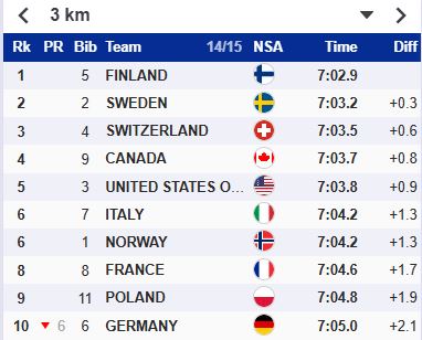 Швеция первая в квалификации, Финляндия - вторая, а Канада запрыгнула на третье место. За ними Швейцария, Норвегия, Германия и США.