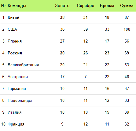 По итогам субботы сборной России удалось совершить настоящий рывок, благодаря которому наша команда взлетела на четвёртую строчку в медальном зачёте, обойдя Австралию и Великобританию.