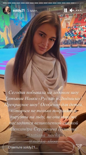 Солдатова сообщила подписчикам, что посетила ледовое шоу Татьяны Навки "Руслан и Людмила". Александра отметила, что осталась очень довольна постановкой."Побывала на ледовом шоу Татьяны Навки "Руслан и Людмила". Прекрасное шоу! Особенно для детей. Им понравятся не только пируэты на льду. Дети также смогут насладиться великолепной сказкой Александра Сергеевича Пушкина", - написала Солдатова в Instagram.