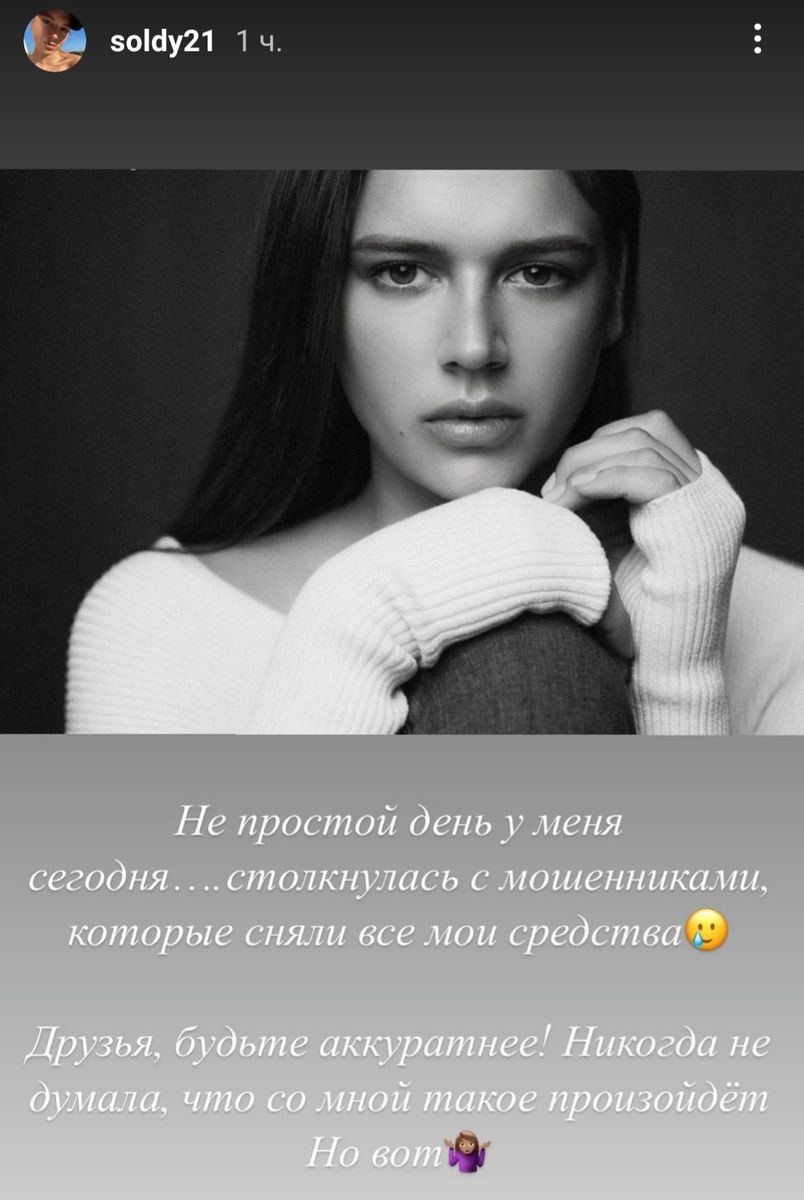 "Непростой день. Мошенники украли у меня все мои средства. Не думала, что такое может со мной случиться. Но вот", - написала Солдатова, не став раскрывать подробности.