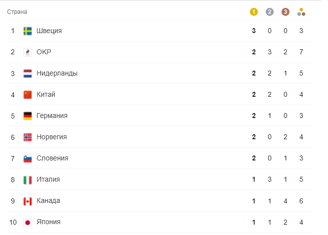 На данный момент сборная Олимпийского комитета России занимает 2-е место в общем медальном зачёте соревнований с двумя золотыми медалями. На первом месте - сборная Швеции (3 золота).