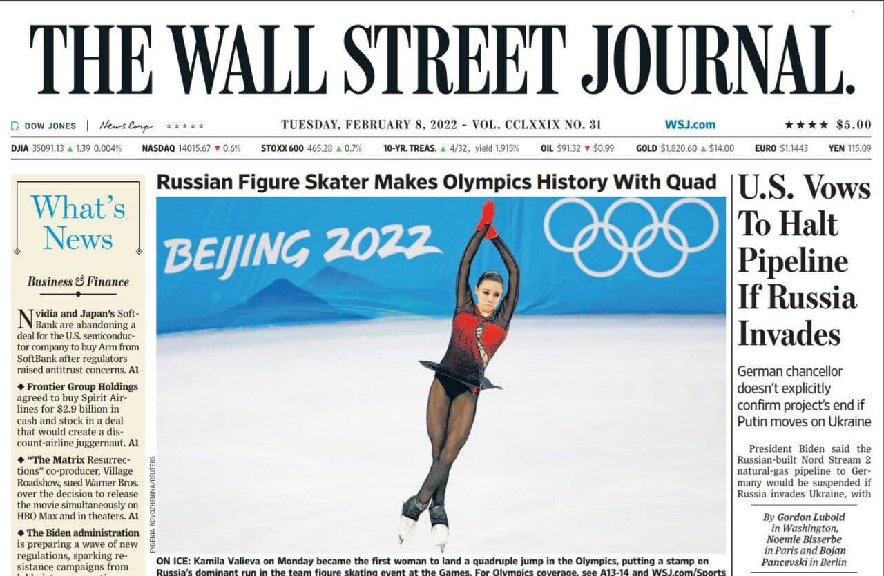 Журналисты популярного журнала разместили материал о Валиевой на первой полосе свежего номера рядом с новостями про бизнес и реакцию Байдена в случае нападения России на Украину.