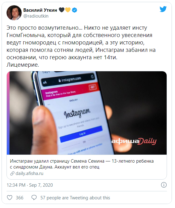 Накануне стало известно, что менеджеры Instagram приняли решение удалить аккаунта 13-летнего Семёна Сёмина, страдавшего от синдрома дауна
