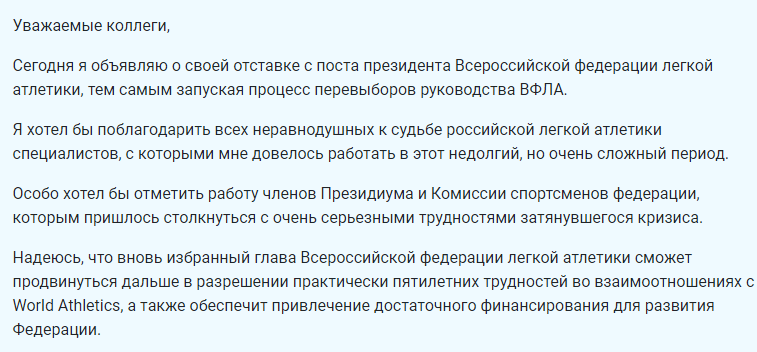 В понедельник, 13-го июля, стало известно, что уже бывший глава Всероссийской федерации лёгкой атлетики (ВФЛА) Евгений Юрченко, который возглавил организацию с февраля текущего года, подал в отставку