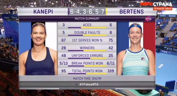 27-летняя голландская теннисистка 6 раз подала навылет, а также совершила 8 двойных ошибок и реализовала 6 брейк-пойнтов (из 11). Канепи отметилась 3 эйсами, а также совершила 5 двойных ошибок и 5 брейков.