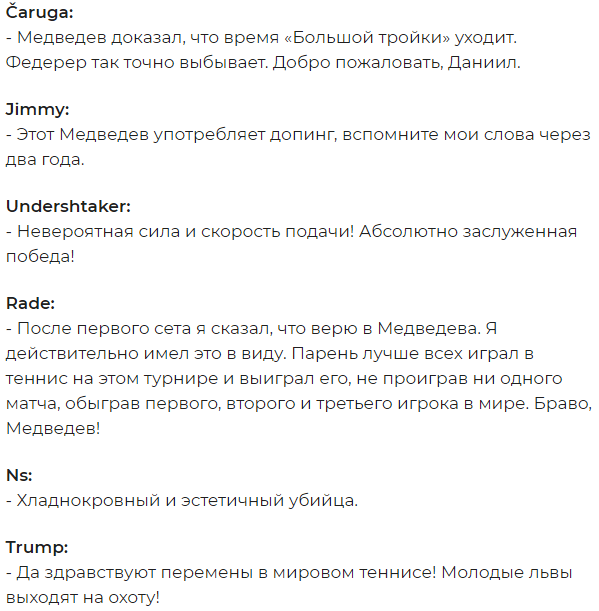 Сразу после матча в зарубежном сегменте социальных сетей англоязычные поклонники тенниса буквально засыпали комплиментами спортсмена из России:
