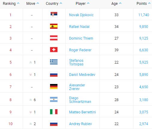 Топ-10 рейтинга ATP (12 октября)