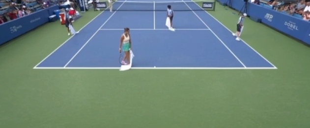 Соболенко на подаче. И сразу она выиграет первый розыгрыш. 00:15.