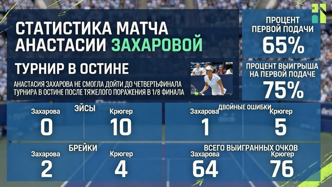 Sport.ru / Теннис. 88-я ракетка мира Анастасия Захарова не сумела пробиться в четвертьфинал турнира WTA-250 ATX Open в Остине (США).