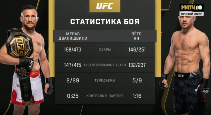 Статистика тоже добавляет интриги. У Двалишвили сейчас рекорд 21–4, и он подходит к защите титула в великолепной форме, тогда как Ян имеет 19–5 и стремится вернуться в элиту дивизиона. Для Мераба этот поединок — шанс оформить уже четвёртую защиту пояса в одном календарном году, а для Яна — возможность снова претендовать на чемпионство.