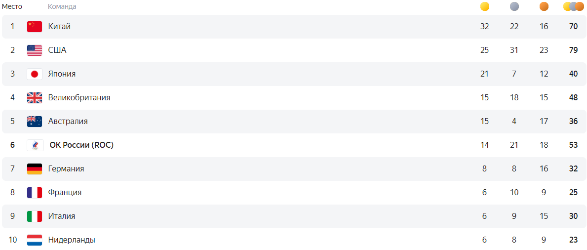 К сожалению, по итогам дня Россия опустилась на шестое место в медальном зачёте. У Австралии и Великобритании на одну золотую медаль больше. Лидирует Китай, на втором месте - США, замыкает тройку - Япония. Стоит отметить, что Россия на третьем месте, если считать только суммарное количество медалей.