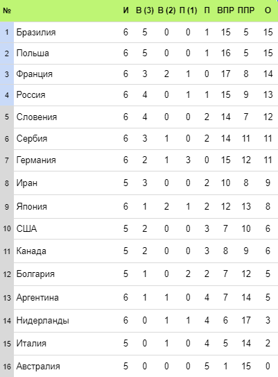 После шести туров в копилке сборной России 13 баллов, что на два очка меньше, чем у лидирующих в таблице поляков и бразильцев. На текущий момент россияне занимают четвёртую строчку, которая позволяет команде рассчитывать на выход в плей-офф соревнований.