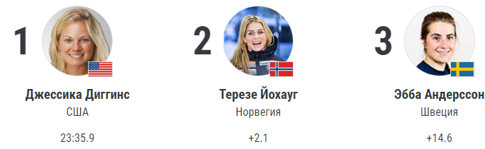 Что касается самой гонки, то основная борьба шла между фавориткой почти всех забегов – норвежкой Терезой Йохауг и американкой Джессикой Диггинс. Начиная с отметки 4.3 км, обе лыжницы соревновались уже между собой, поочерёдно выходя вперёд. После шести километров пути норвежка уступала 8 секунд, но уже к следующей отсечке она умудрилась обогнать Диггинс на одну долю секунды. Была впереди Тереза и за километр до финиша, но вот решающий отрезок она проиграла, сенсационно отдав первое место американке. В итоге Йохауг уступила Диггинс всего две секунды и, конечно, проигрывать таким образом всегда обидно.