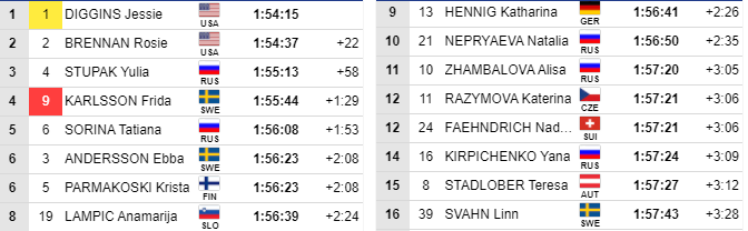 Sport.ru/Лыжные гонки. Россиянка Юлия Ступак после победы в гонке преследования на пятом этапе Тур де Ски, который проходит в Тоблахе, поднялась на третье место в общем зачёте многодневки обойдя представительницу Швеции Фриду Карлссон, которая показала в гонке преследования только 13-й результат. Татьяна Сорина - пятая. Наталья Непряева замыкает топ-10.