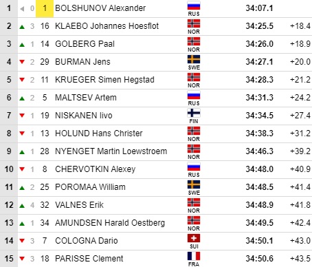 В ТОП-10 в результате (помимо Большунова, конечно) оказались Артём Мальцев (6-е место, +24,2) и Алексей Червоткин (10-е место, +40,9). Остальные россияне выступили следующим образом: