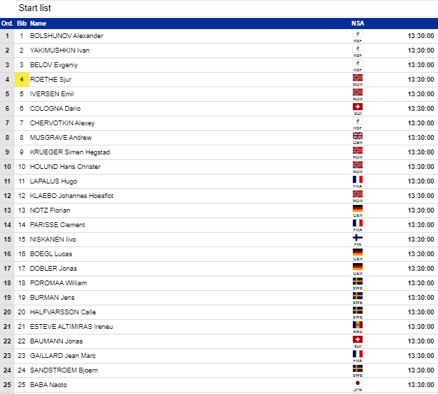 На первой отсечке лидирует норвежец Холлунд, далее Белов, Гайар, Иверсен и Большунов.