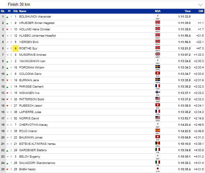 Один Большунов из россиян, 5 норвежцев и британец Масгрейв в группе лидеров. Бурман и Нисканен отстали на 15 секунд, Якимушкин, Червоткин и Паттерссон - на 20.