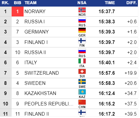 Как и ожидалось, Норвегия сегодня победила, а вот второе место Швейцарии - это большая сенсация. Россия отдала серебро и вынуждена довольствоваться бронзой. Конечно, с Большуновым на финише итог был бы другой, но Александру надо восстанавливаться и готовиться к личным гонкам. На этом трансляция завершена, провёл её Вячеслав Горбачёв, всего хорошего.