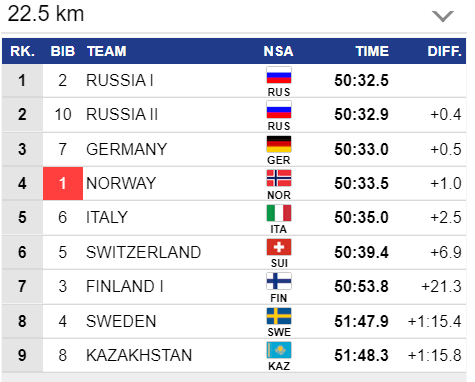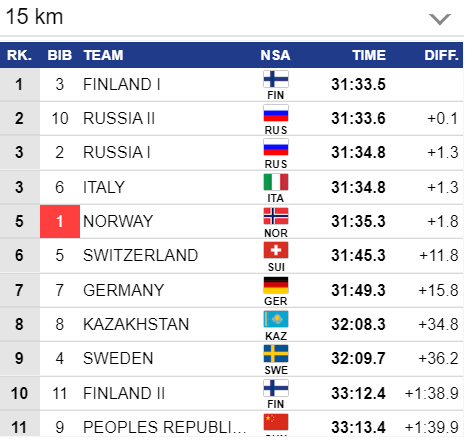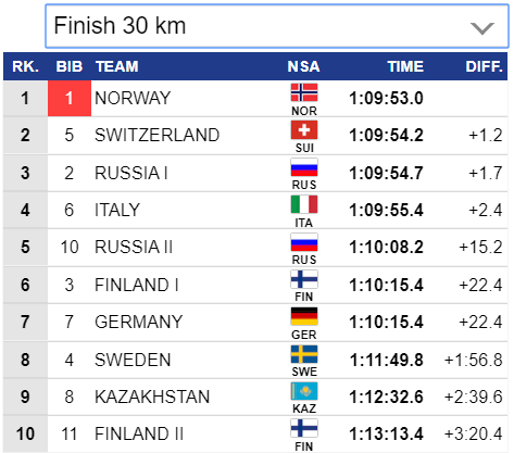 Пока у нас никто не отрывается, идёт одна большая группа. Россияне в середине, а на лидирующих позициях Норвегия, Швейцария и Финляндия.