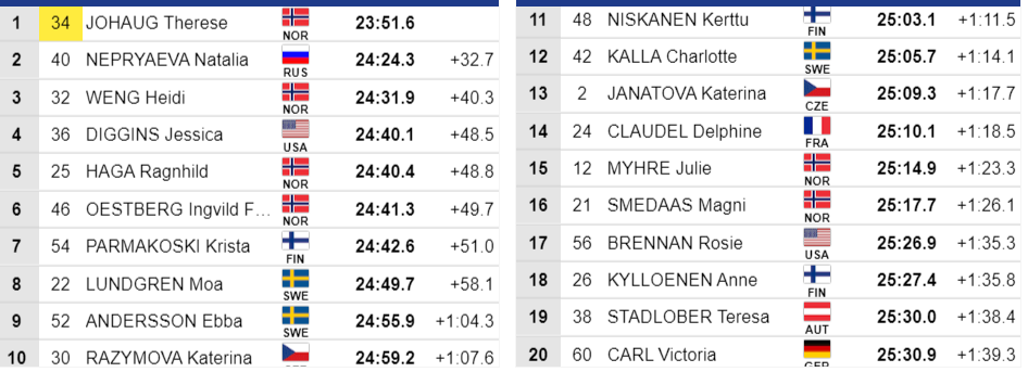 Только четвёртый разгон у Джессики Диггинс, в первой тройке остаётся Лундгрен.