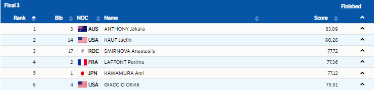 Медаль на свой счёт записала 19-летняя россиянка Анастасия Смирнова. Она заняла третье место. Победу одержала представительница Австралии Джакара Энтони. Серебро забрала Джелин Кауф из США.